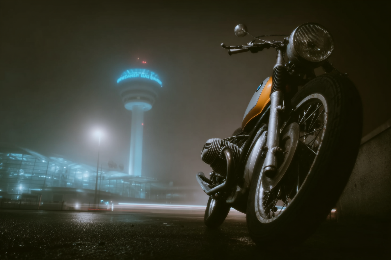 I am at the airport in Menorca. People are standing quietly, waiting for their luggage, which does not arrive. I walk out of a room. A woman dressed entirely in white comes toward me. I bend forward and, with the waistband of my trousers, pull the door shut. It is so funny that we both start laughing. I do not have any keys, but my brother opens the door for us. I bend forward again and the door closes once more. We laugh again. My brother tells me I should buy a BMW motorcycle. I walk through the airport but cannot find a BMW dealer. Later I am riding a motorcycle back, turn off the engine, and roll too far. I park the motorcycle and go back into the room. There I meet a gallerist. I ask him where I can find a BMW dealer, but then I look it up on Google myself. Everyone else leaves the room. I select a series of images and have to register them on a computer before I can purchase them from the gallerist. Afterwards, I want to negotiate the price. At the top of the letter I write that my parents would have done the same, then I delete the line again but ask for a ten percent discount. I am tired, but I think I should not stay in the room. I should use the time to explore the island.