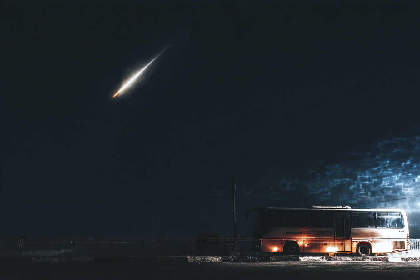 I am riding on a bus in Scandinavia and take out my camera. I make sure that nothing falls out of my bag. Suddenly, a satellite shoots down from the sky toward the earth and lands right next to us.