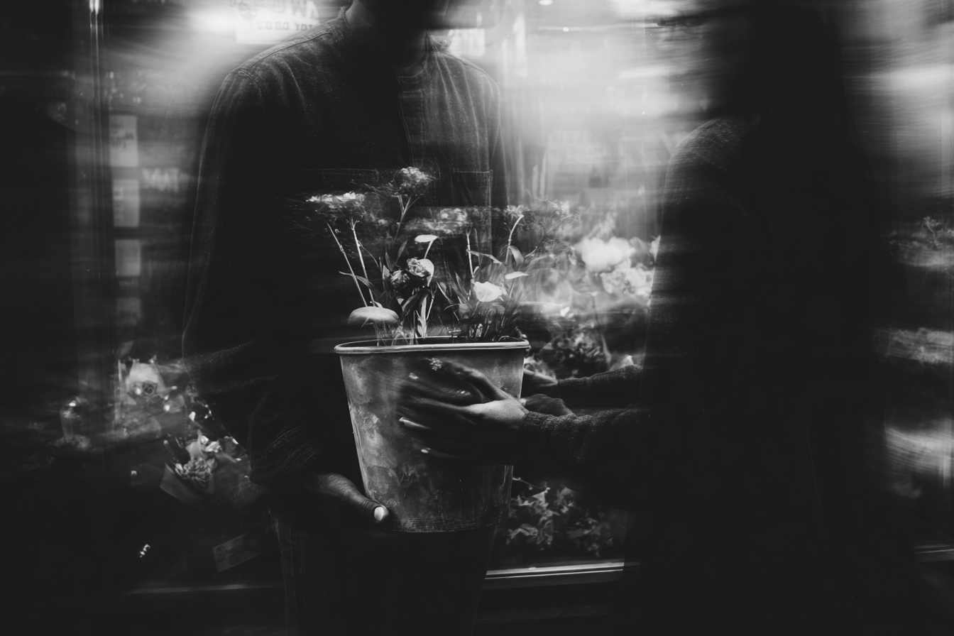 A man brings a large pot to a florist. The plants in the pot were planted too close together. The shop is about to close, but a woman takes the pot and will sort it out.