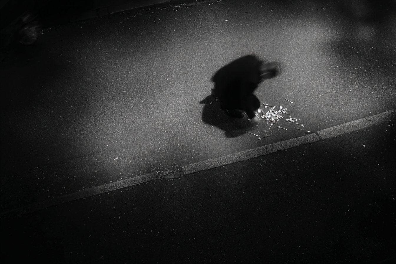 A man is unwashed and hungover. A pile of silverware falls onto the street. He picks it all up again. A woman is contacted by a man she wanted to speak to, after mentioning him to the unwashed man. Synchronicity.