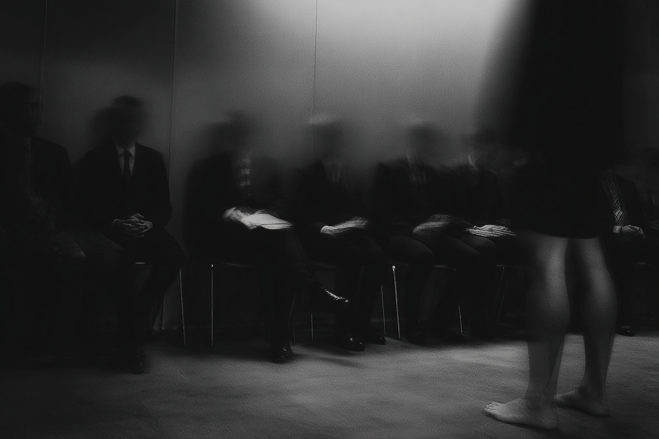 A group of men pretend to be politicians standing for election. They are preparing for a second round of interviews. One of them is very arrogant and represents a conservative party. He is not wearing trousers, only boxer shorts.