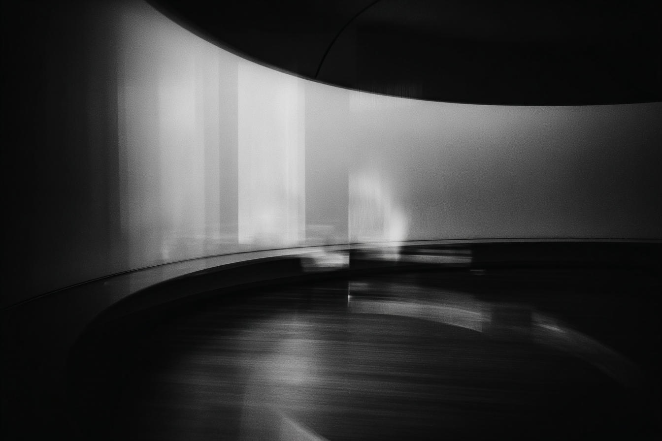 A man looks at photographs of an Art Deco house. The rooms are oval. The house is hidden among other houses. He drives there but cannot stop the car properly. His mother sits beside him.