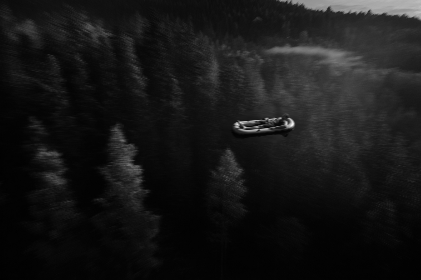 A man is lying in a rubber dinghy that was once moored to his childhood home. The wind has carried it away. He drifts through a forest towards a town, carried by the increasingly strong wind.
