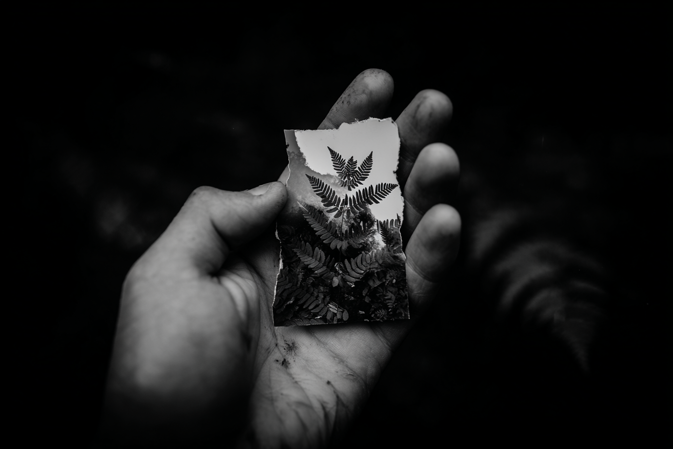 A hand holds a photograph of ferns, its edges cut out so that they appear softly blurred.