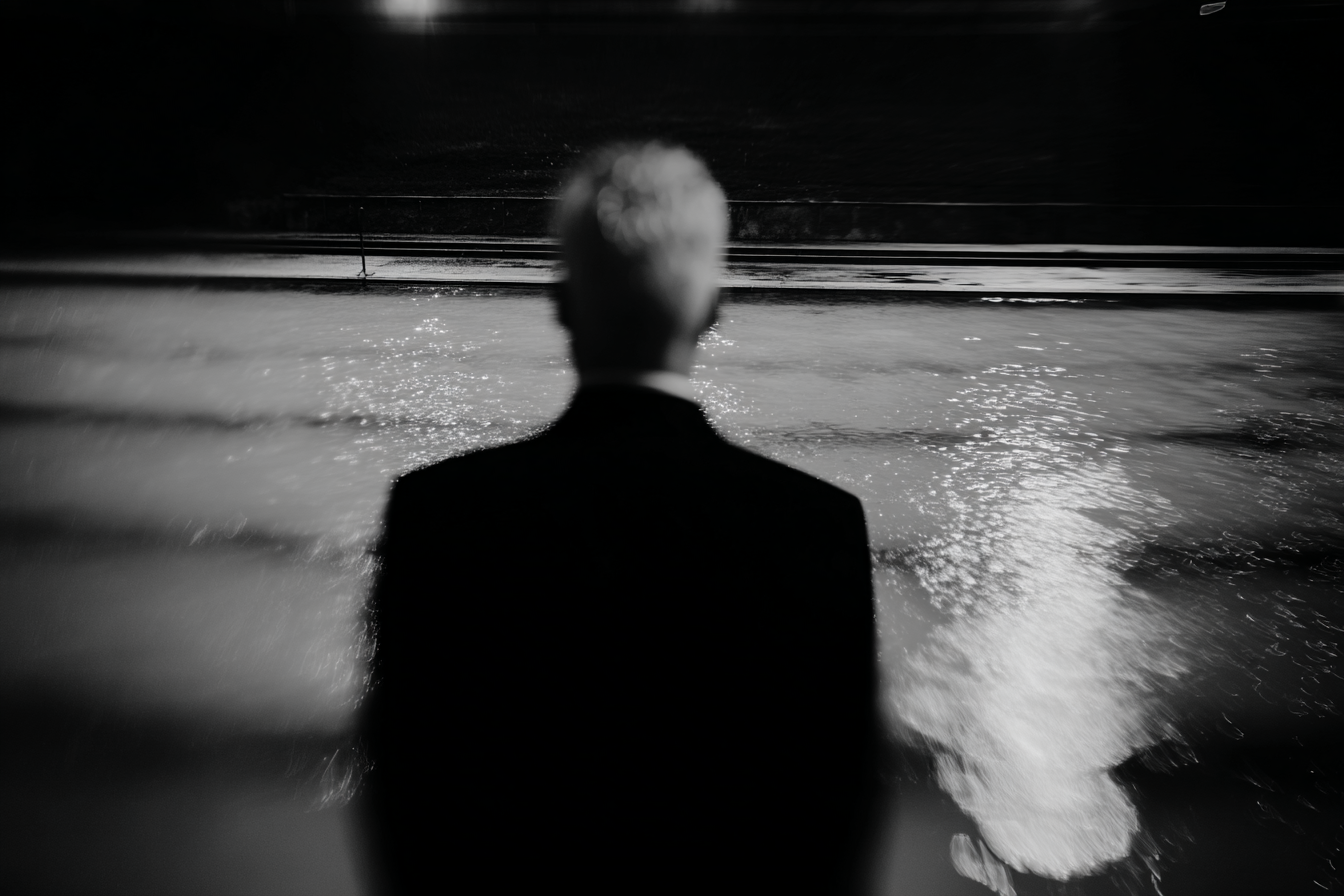A man stands in front of a swimming pool. He is supposed to play a piece by J. S. Bach. He is afraid he cannot do it. But when the starting signal goes off, he plays the entire piece, including the final chords.
