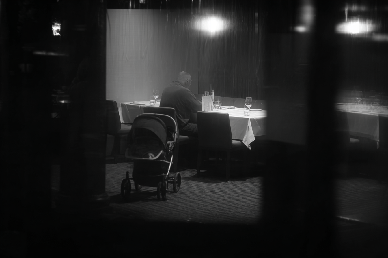 A man walks into a restaurant. The waitress shows him to a free table. A woman is standing there with a pram. She speaks Flemish. The man squeezes past them and sits down in the corner. The baby wakes up. He speaks to it in Flemish. The mother comes to pick it up.