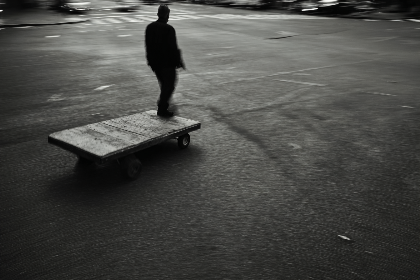 A man rides down a street on a large wooden board with small wheels, looking for people. At first cautiously, then boldly across a junction. But they are gone.