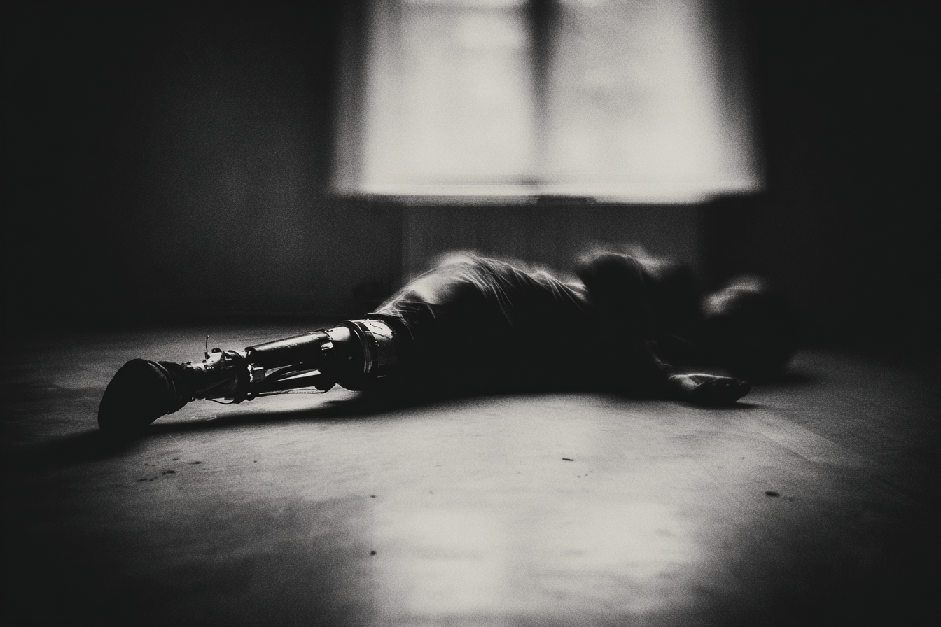 A man lies on the floor with a modern leg prosthesis, a metal and carbon framework. He says, “What else is going to happen to me in this life?”