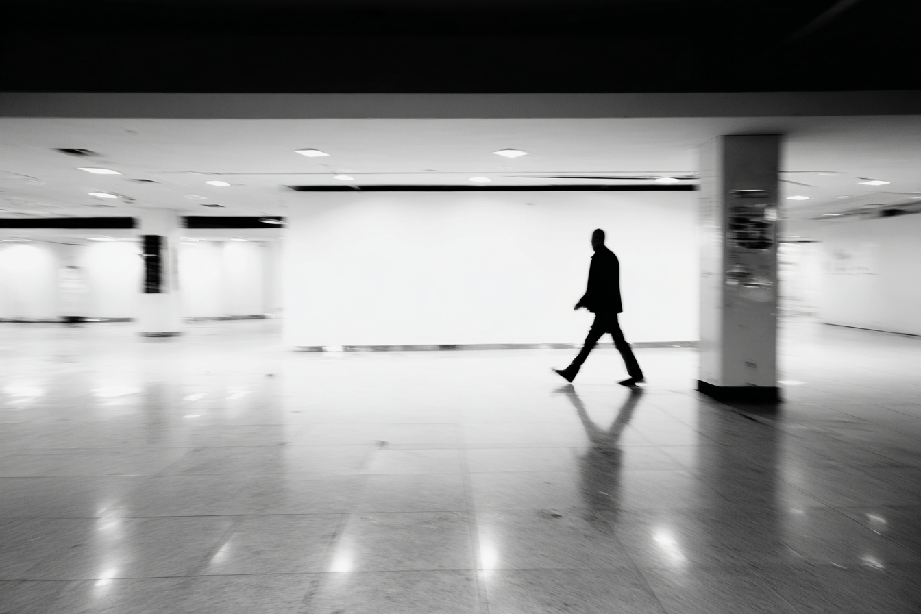 A man walks barefoot through a shopping mall, singing a song in French about believing in himself.