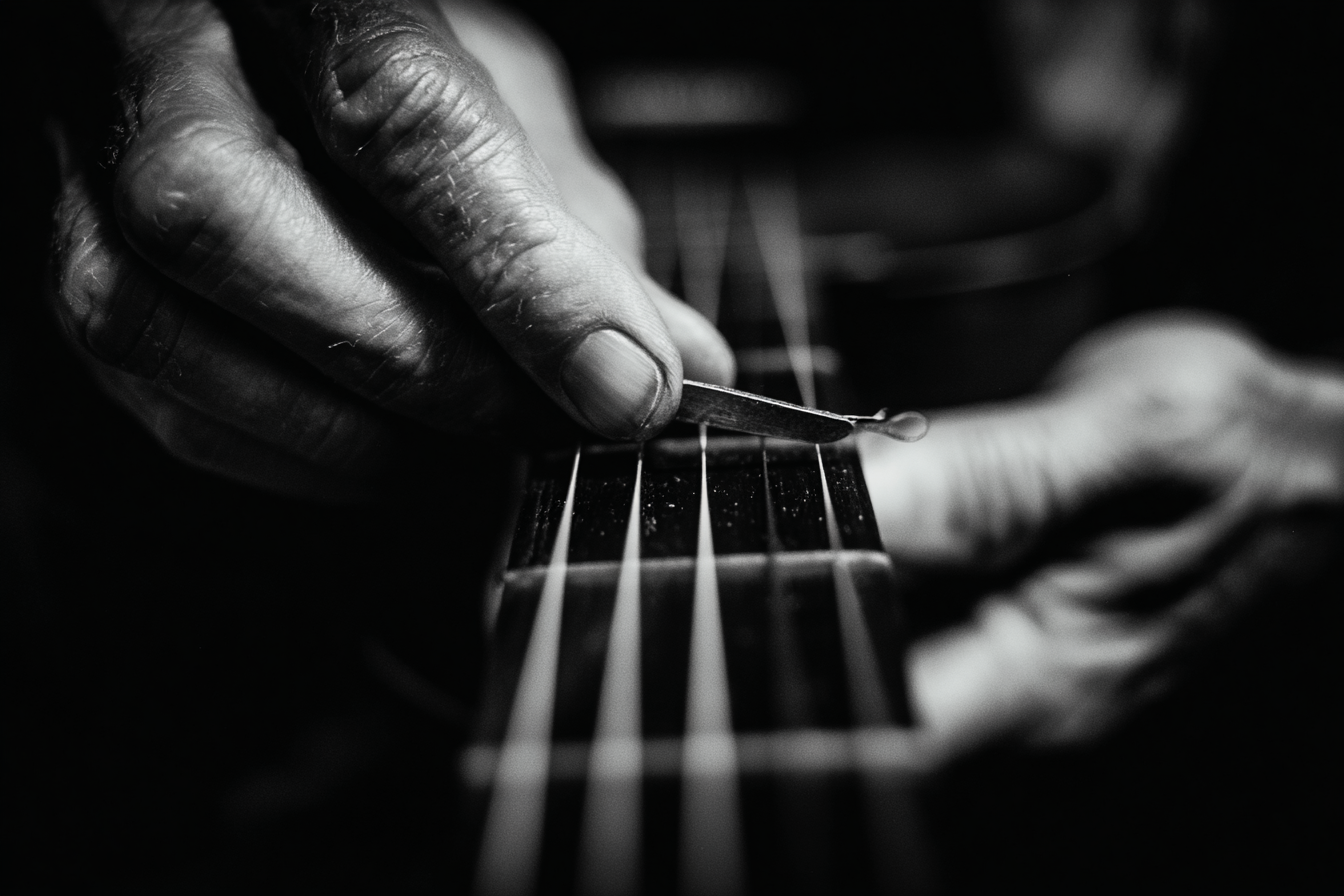 A man plays the guitar, striking the strings with a nail file.