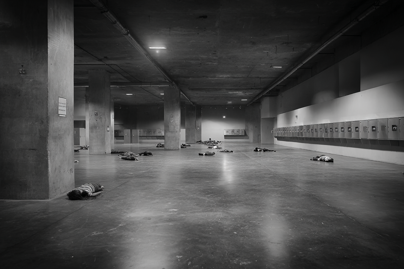 Toilets overflow. Letterboxes are being fixed to a wall. Then people lie down on the floor, some on top of others.