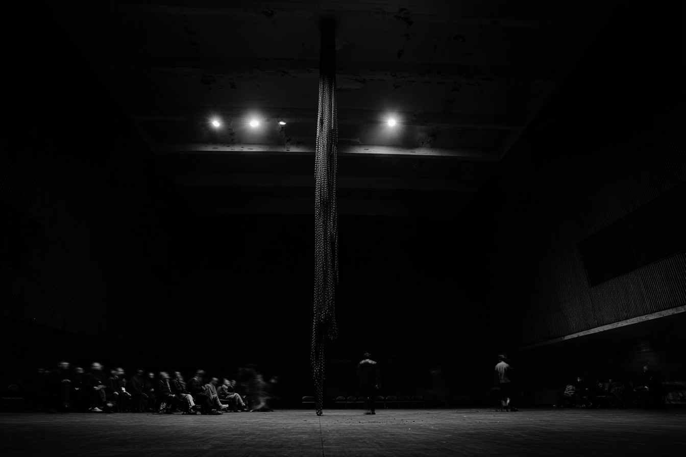 For a theatre performance, a man rolls up a flag made of chains around a pole.