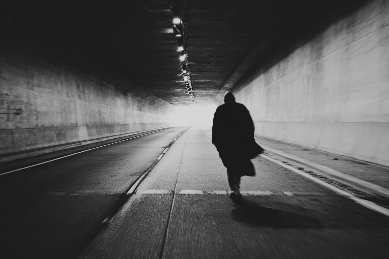 A man walks into a tunnel. The wind is so strong he can barely move forward.