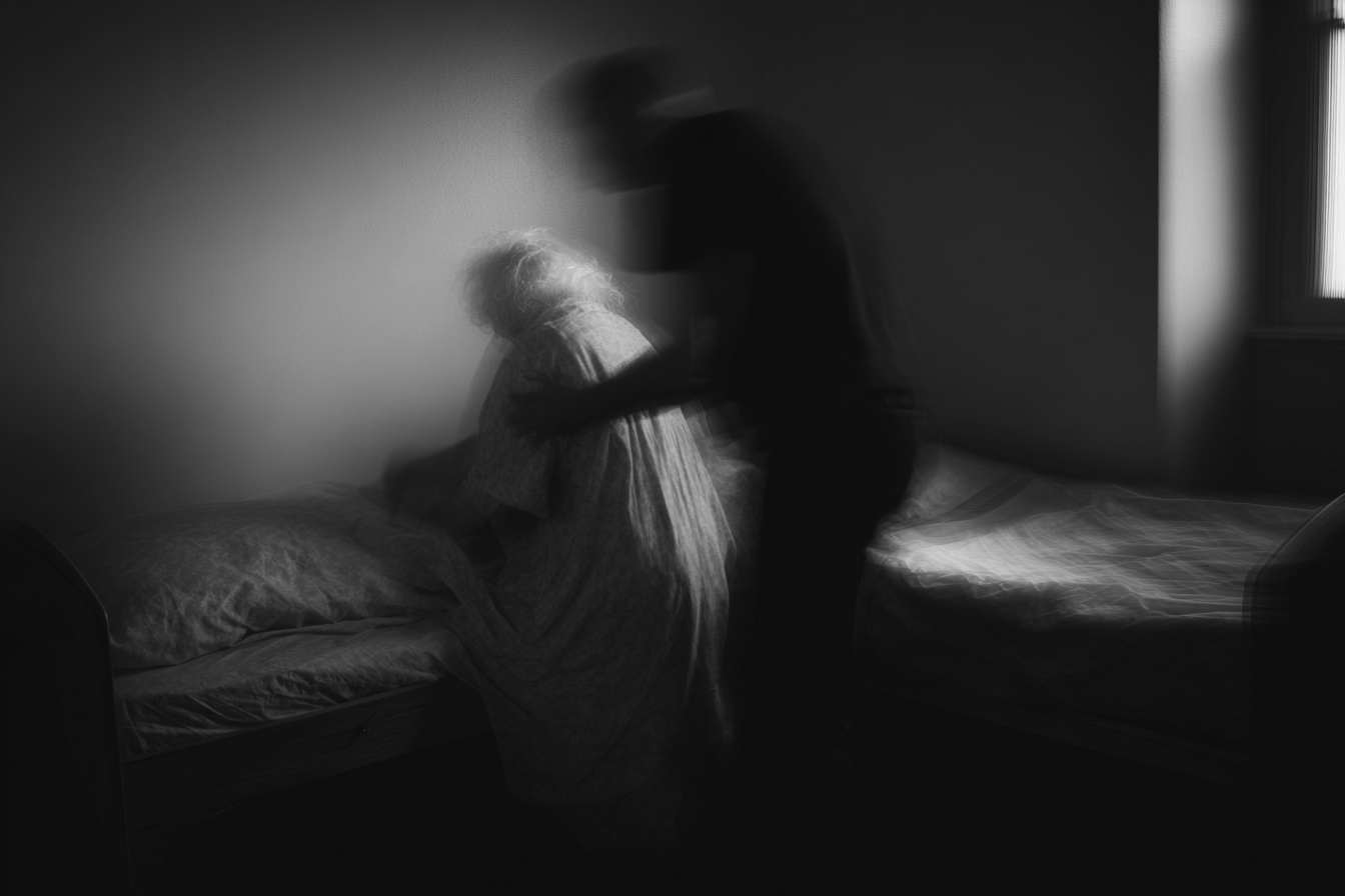 A man enters a house. His daughter shows him a small room where he can sleep. There are two beds. In one of them, his mother lies half slipped toward the floor. He lifts her back onto the bed.