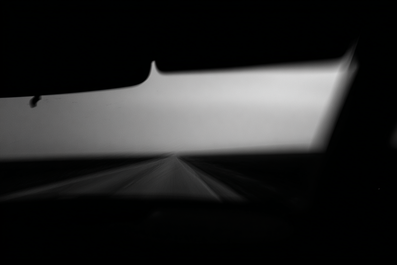 Someone hands a man a packet of aspirin. He takes the tablets out to save space. Then he eats yoghurt from two containers. One of them is filled with round slices of bread that have become soaked with yoghurt. He gets into a car and sits behind the driver. A couple has already driven ahead. The car is tilted as it moves, but slowly straightens itself while driving.