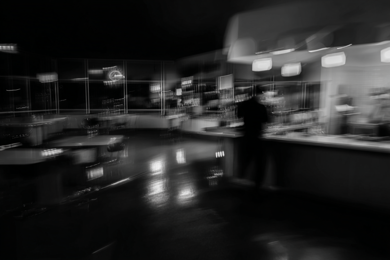 A man orders a tea in a milkshake café. The floor is tilted. He keeps dropping things. The waitress picks them up. Again and again. In the back of the café are swimming pools. They have flavours, like the milkshakes or teas.