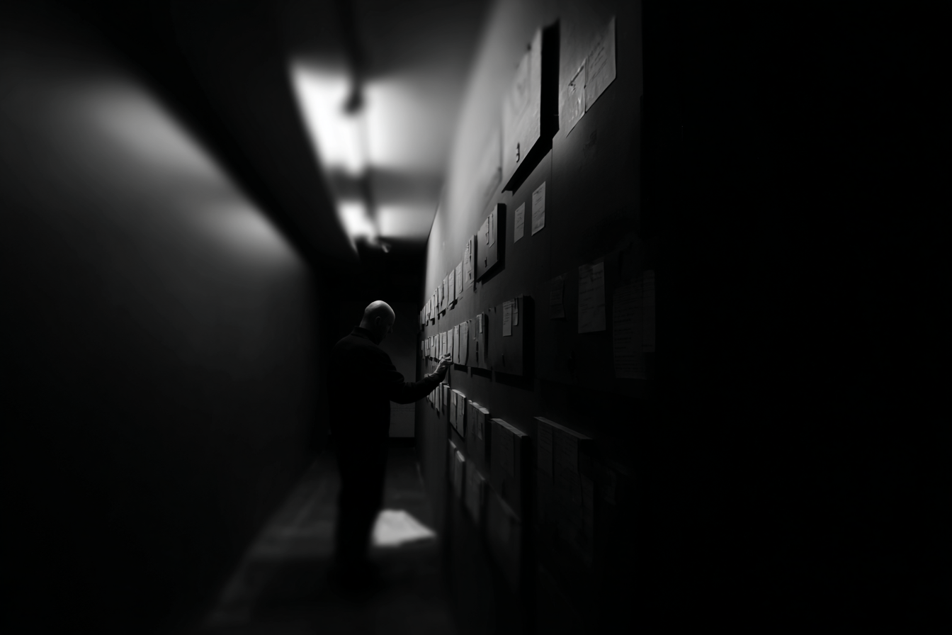 A man composes a melody by tapping boxes attached to a wall in a dark corridor.