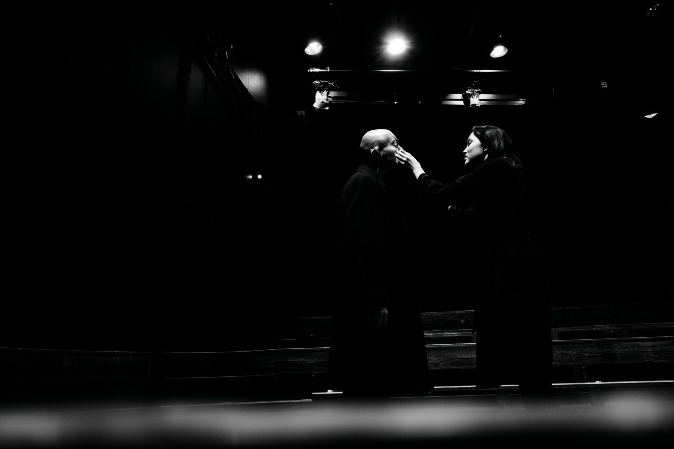 A man stands in a theatre wearing a long black coat. A woman rubs white paste under his eyes to make him cry.