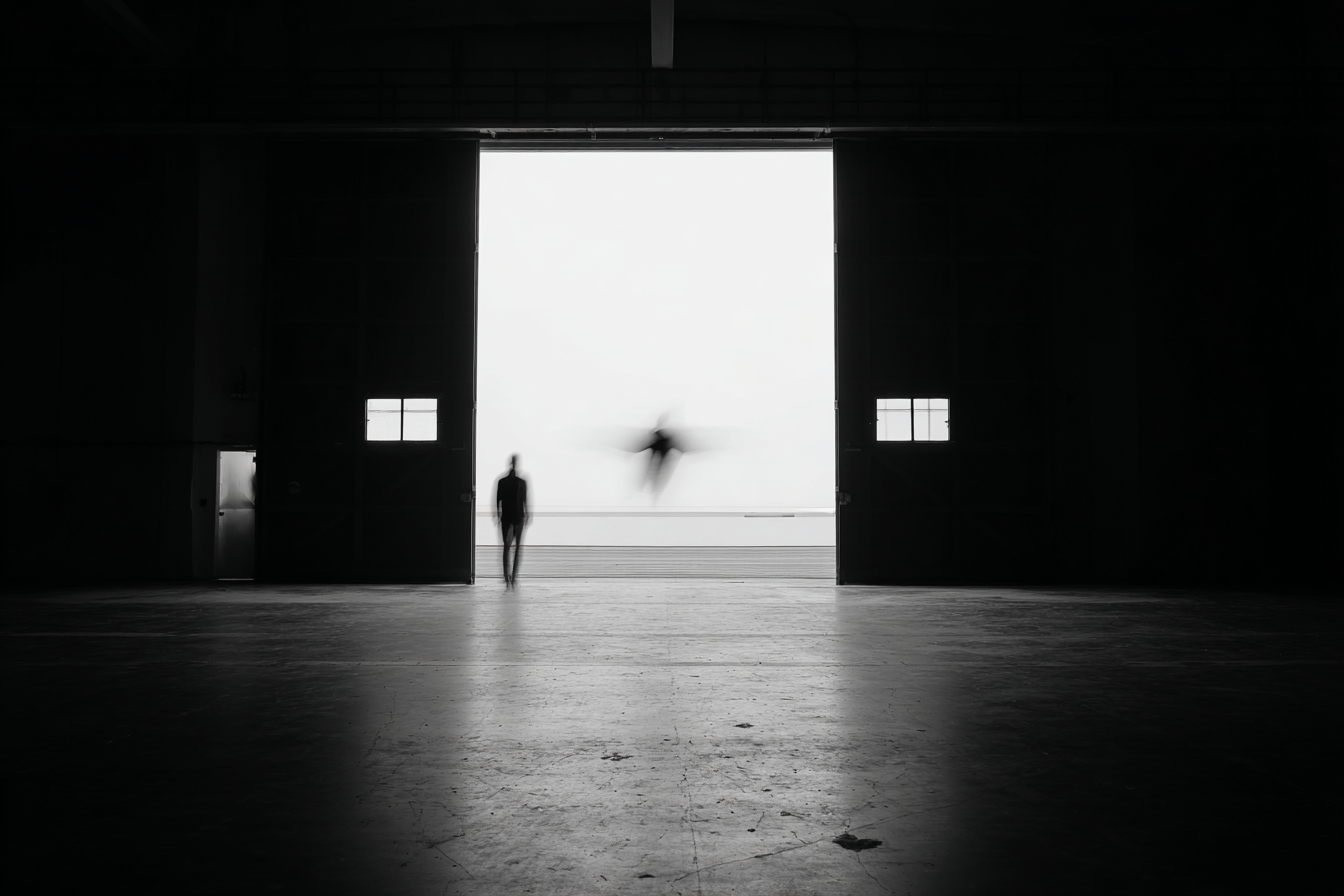 A man walks out of a room. He remembers the number plate EEL 971 from the car that had pursued him in his childhood. The ground bounces slightly. A light wind blows. He lifts off and flies away. A man behind him tells him to pay attention to his neck and relax it.