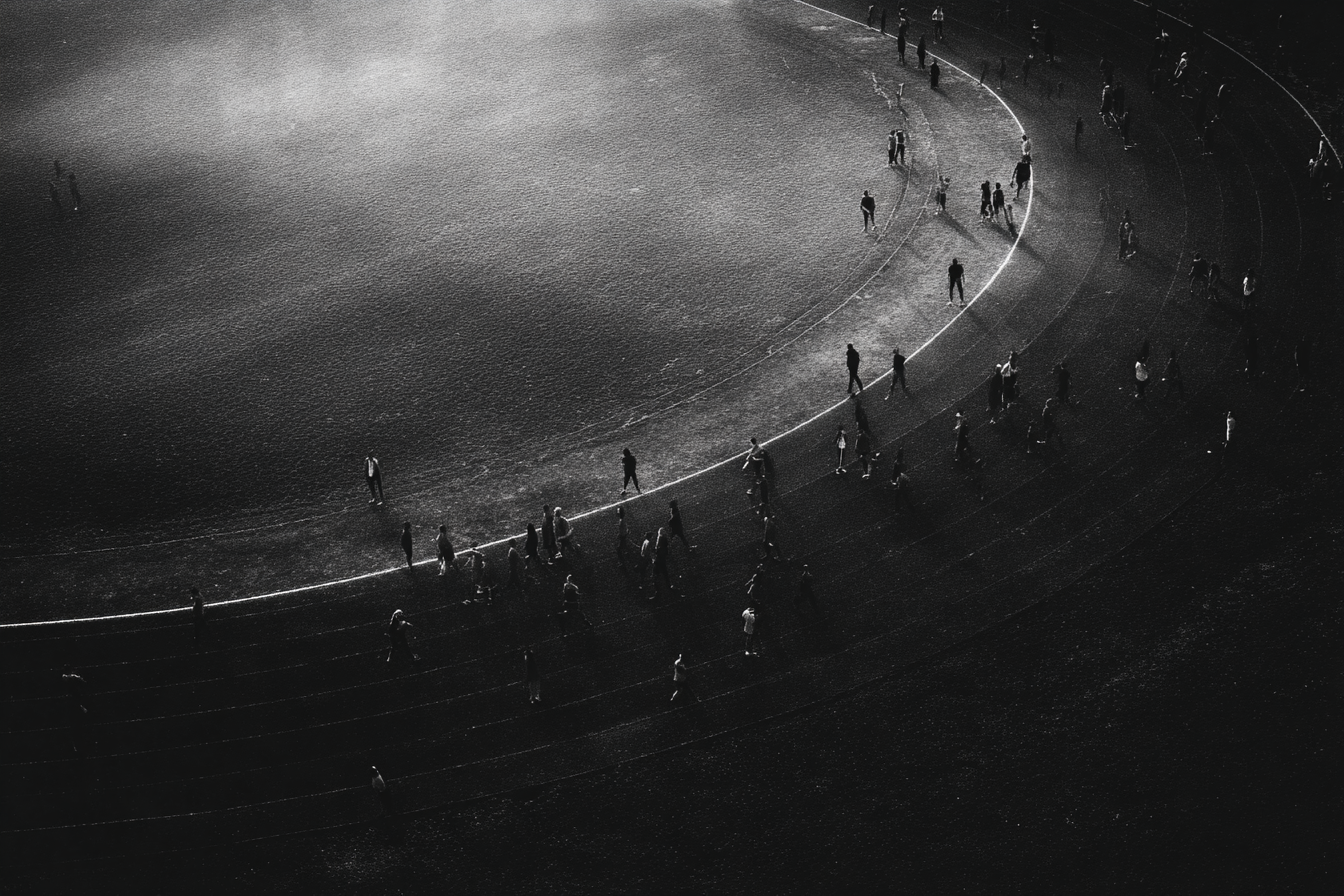 A large wedding reception takes place on a sports field. The men have shaved bald patches into their foreheads. The whole group walks in circles around the track.