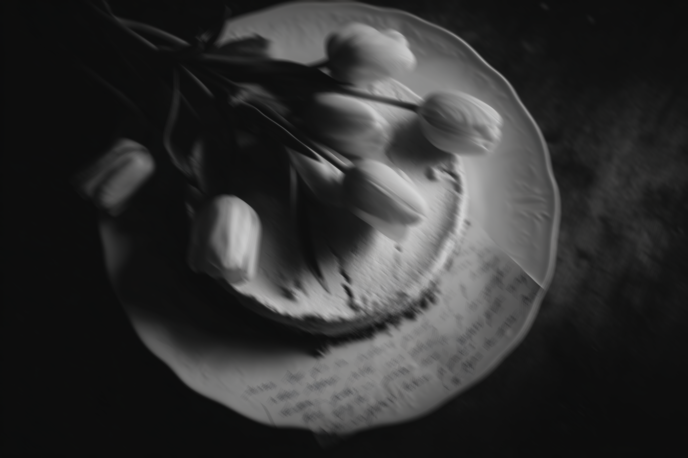 A man looks down at a large round plate holding a cheesecake. On the rim, in his mother’s old handwriting, is a recipe she once wrote. Yellow tulips are placed on top so the warm cake absorbs their flavour. The man is mourning his mother.
