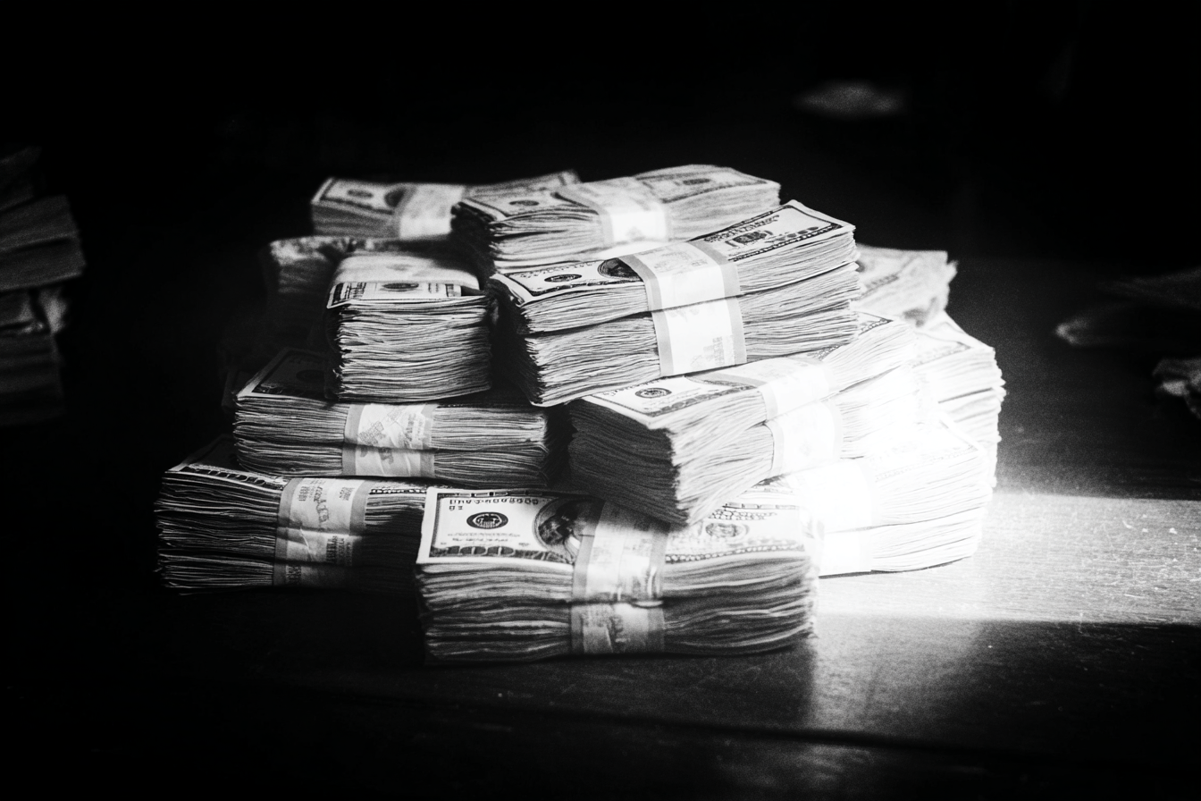 A pile of bundled dollar bills on a table. Is it a million?