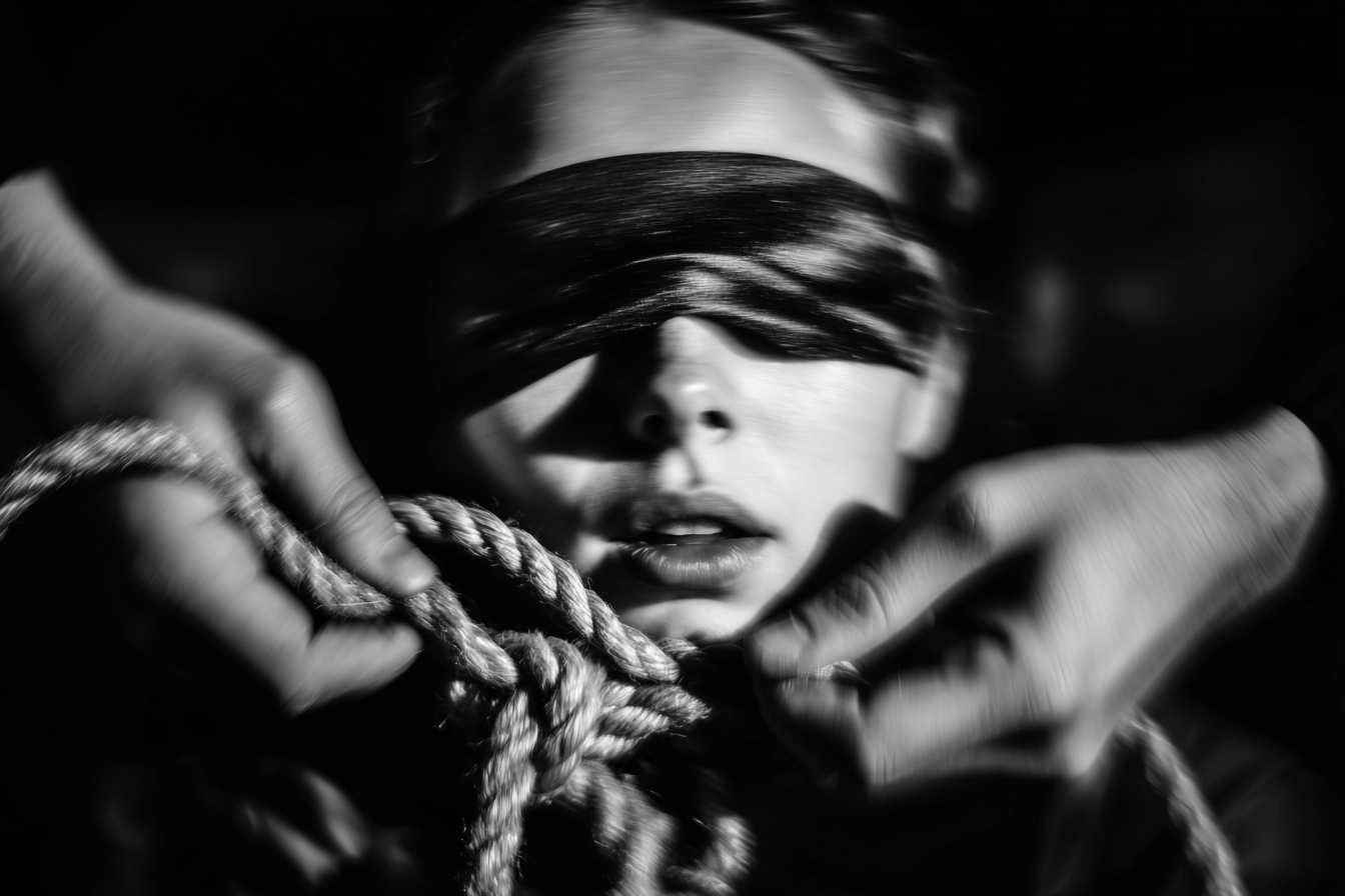 A woman is wearing an eye patch over both eyes. A man asks her who he is and ties her answer, letter by letter, into knots in a rope.